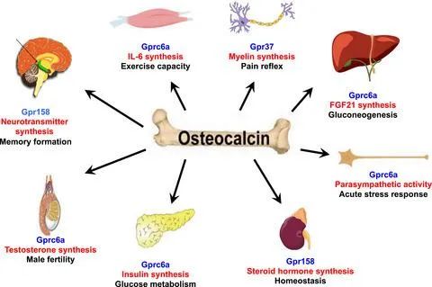 Osteocalcin is a multifunctional bone-derived hormone, that not only plays a key role in bone metabolism, but also has a wide range of influences in energy metabolism, endocrine regulation, and nervous system function. Its use as a biomarker is valuable in the study of bone metabolic diseases, diabetes, and obesity. Future studies will further reveal the specific mechanisms of OCN in different tissues and its potential applications in disease treatment.
